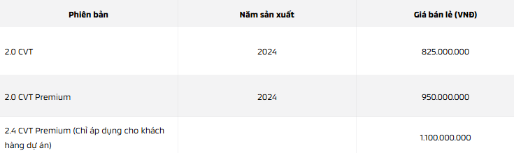 | CVT 2.0 Premium | 950.000.000 | Camera toàn cảnh 360 và 1 năm Bảo hiểm thân vỏ ( trị giá 12 triệu) |